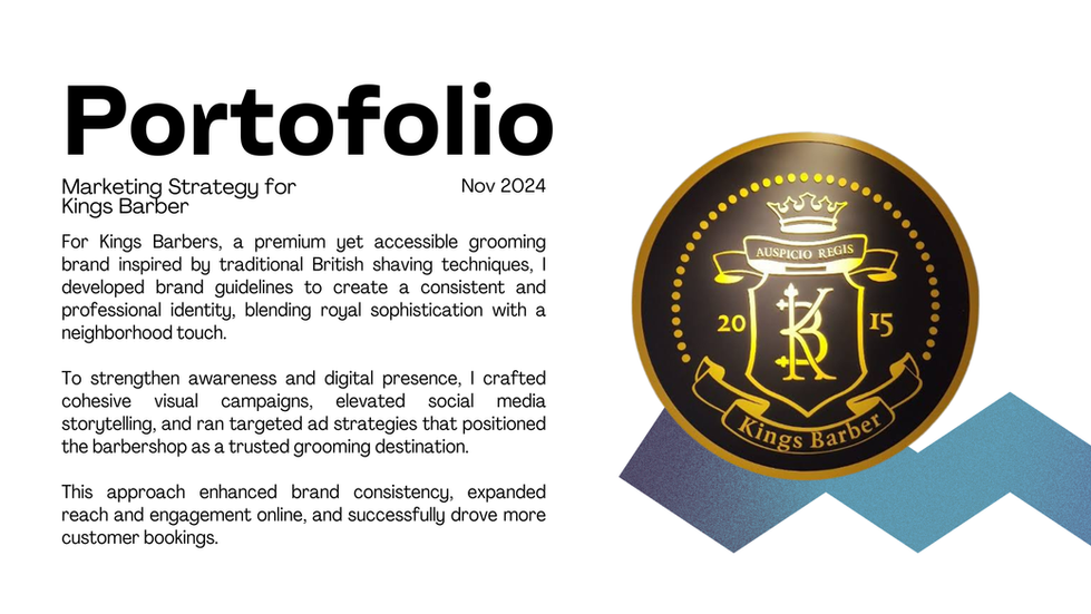 Kings Barbers' social media strategy focuses on showcasing their skilled barbers, traditional techniques, and clean, professional environment through consistent, well-branded content. We’ve designed a distinct brand color scheme to highlight our services, exclusive products, and customer reviews, making each post visually engaging and informative. To grow our reach, we’ll collaborate with local grooming and lifestyle influencers, while targeted ads on Instagram, Facebook will help attract working professionals nearby and drive more bookings.